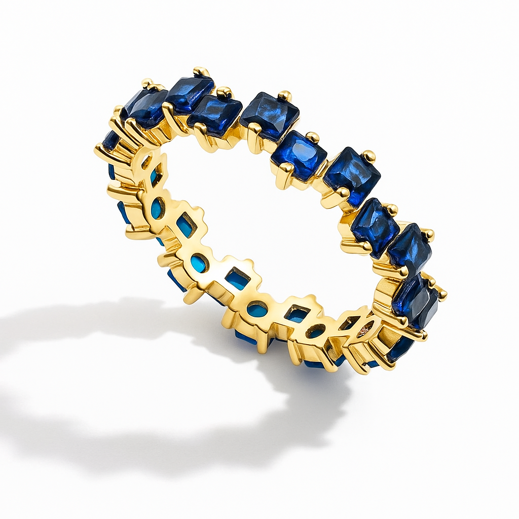 Make a bold yet elegant statement with our Blue Baguette Eternity Ring. This dazzling ring features a continuous row of baguette-cut sapphire blue stones, set in high-quality 18K gold-plated stainless steel for a luxurious, enduring shine.